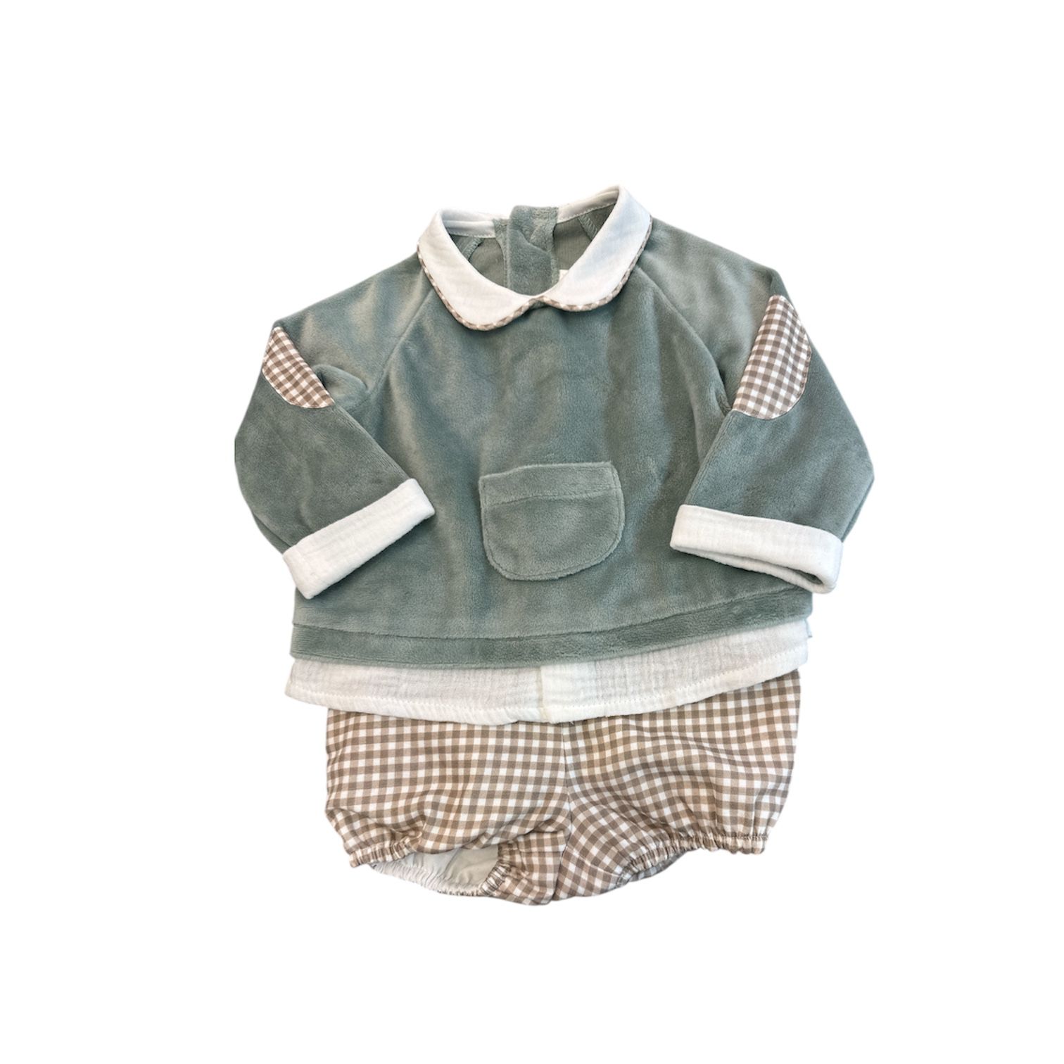 Completo due pezzi maglia in ciniglia con effetto camicia e pantaloncino a quadretti del sur
