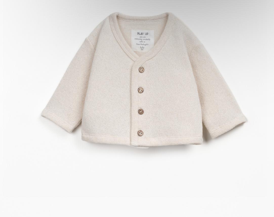 Questa giacca è realizzata in maglia con una miscela di cotone biologico e cotone rigenerativo, nel colore Verde Chiaro. Presenta un interno garzato, scollo a V, polsini elasticizzati e apertura frontale con bottoni in cocco.